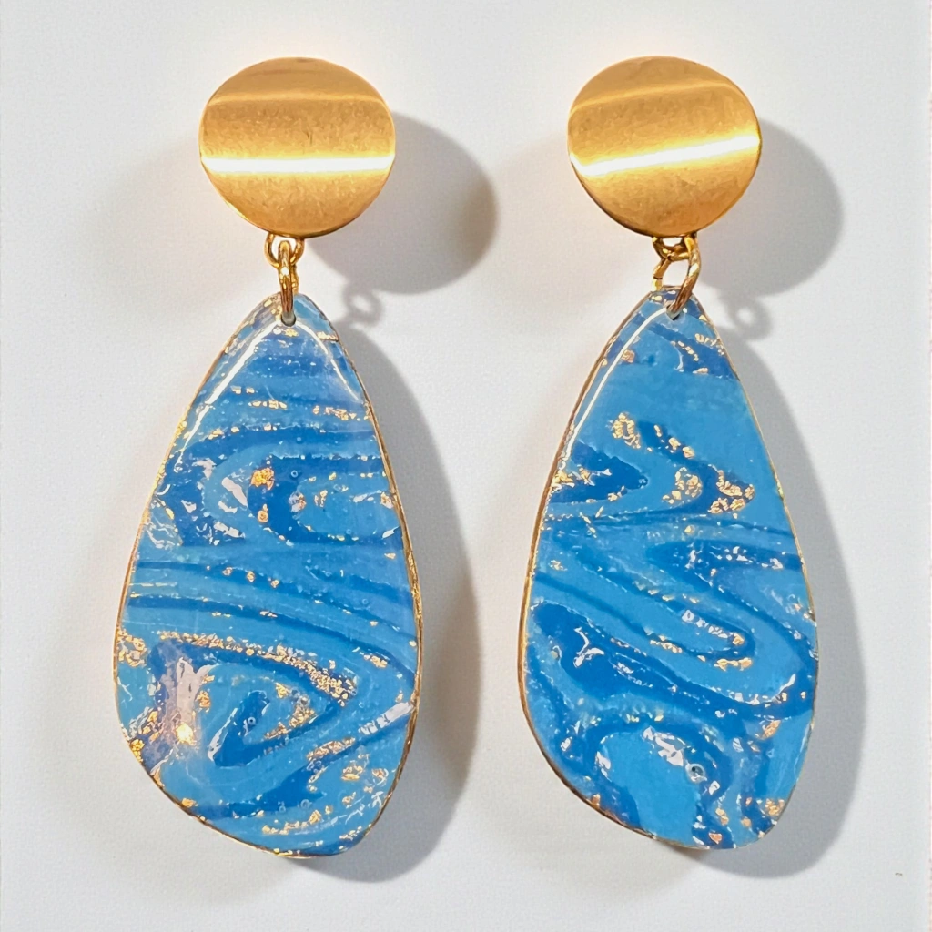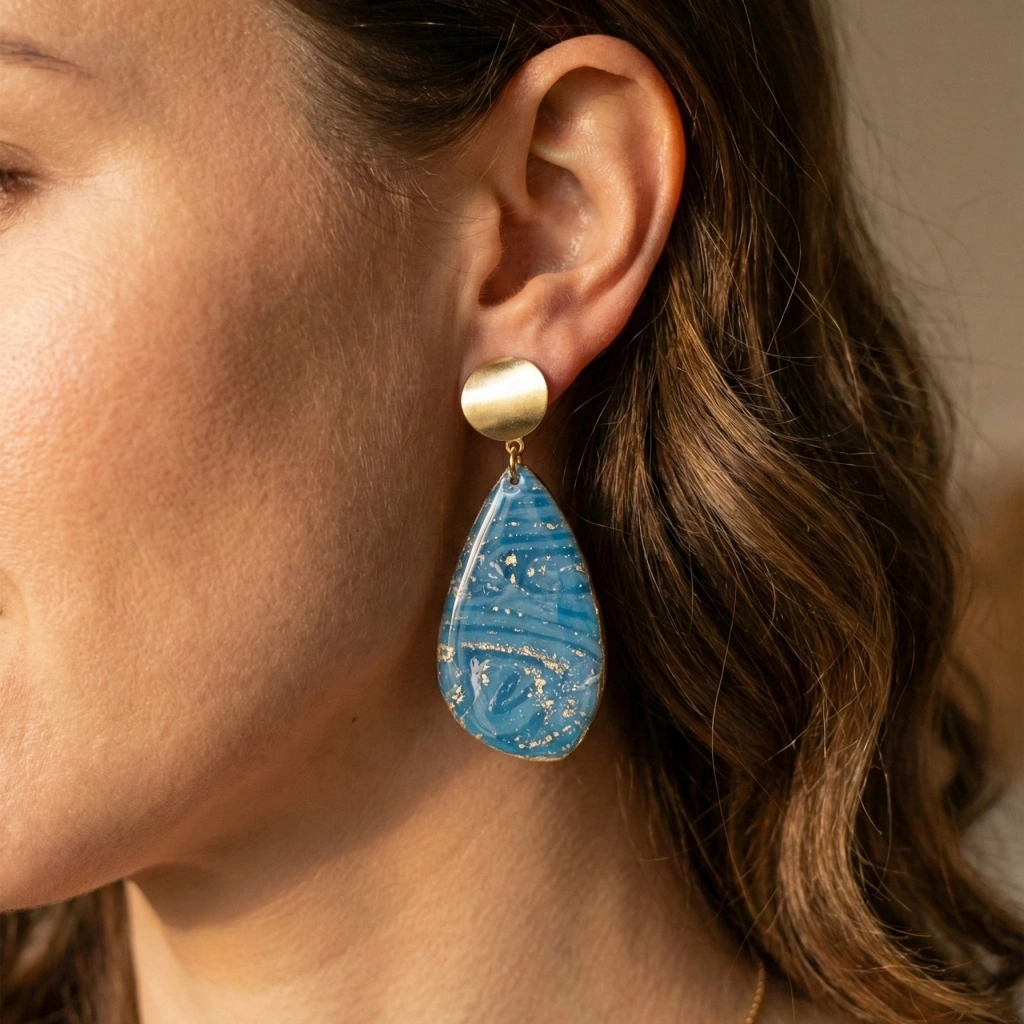 Mavi yüzeydeki akışkan dokular, altın vurgularla dengelenerek güçlü ama zarif bir görünüm sunar.