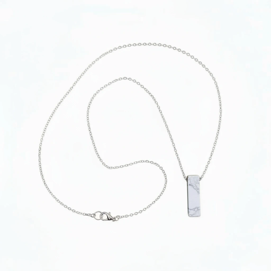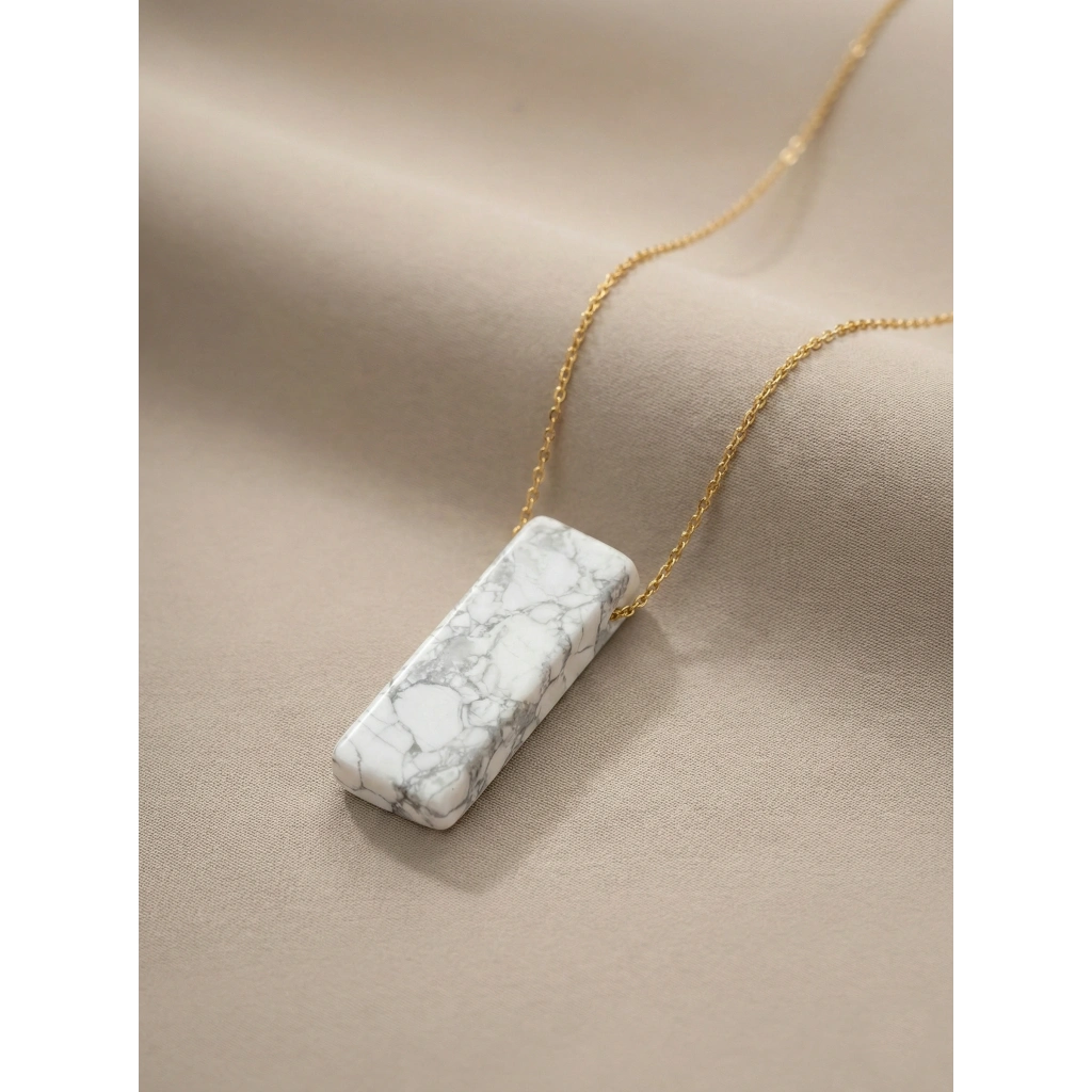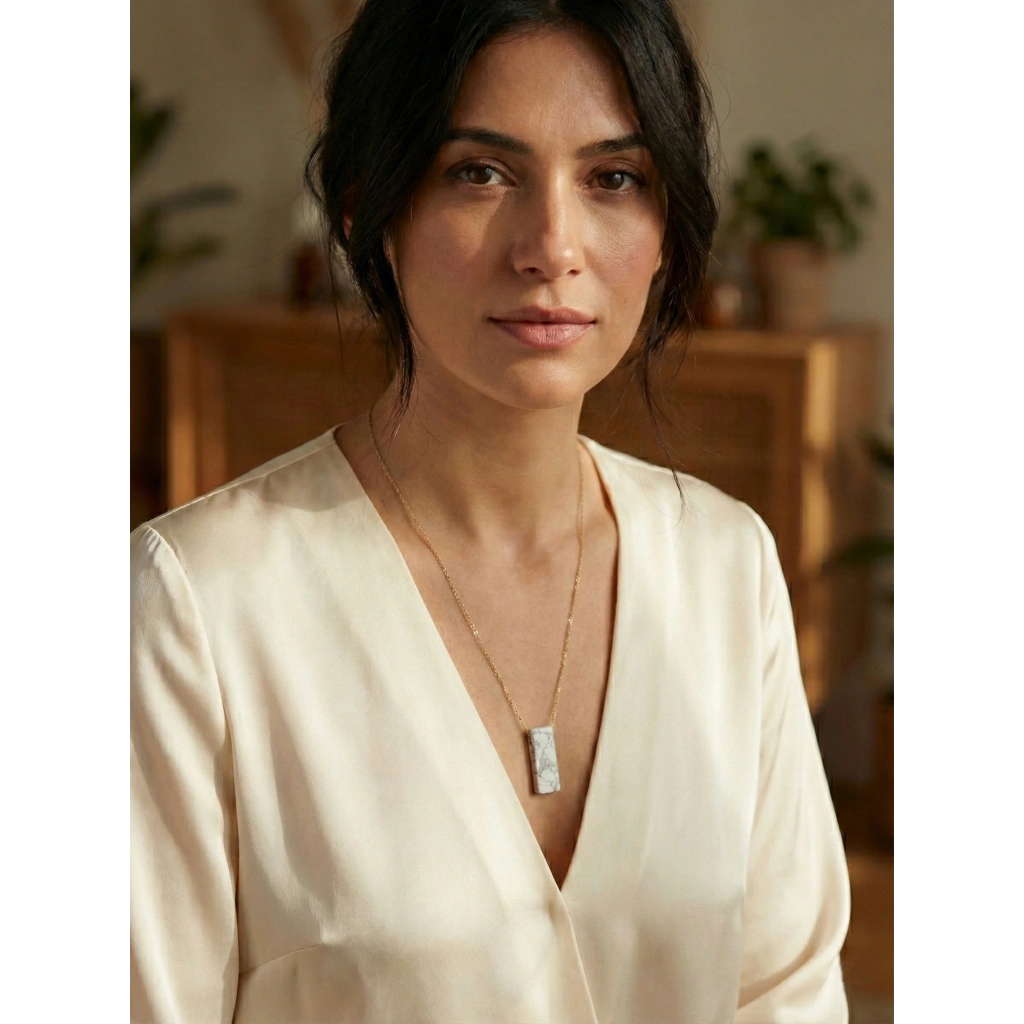 Doğal taşın kendine özgü damar dokusunu yalın bir bar formda sunan, zamansız ve modern bir kolyedir.