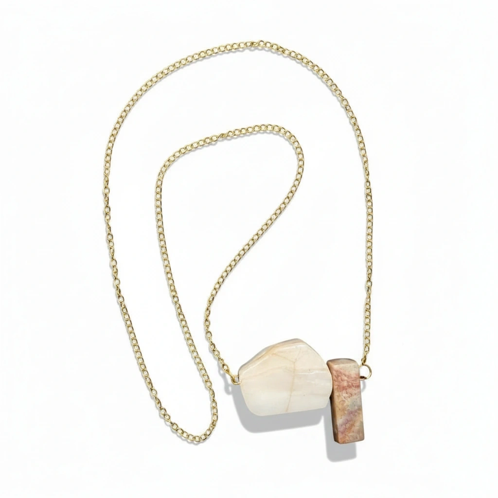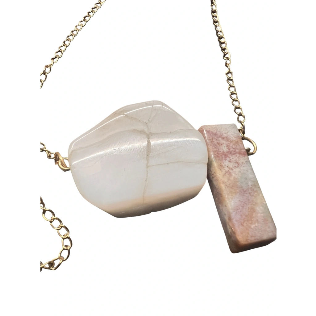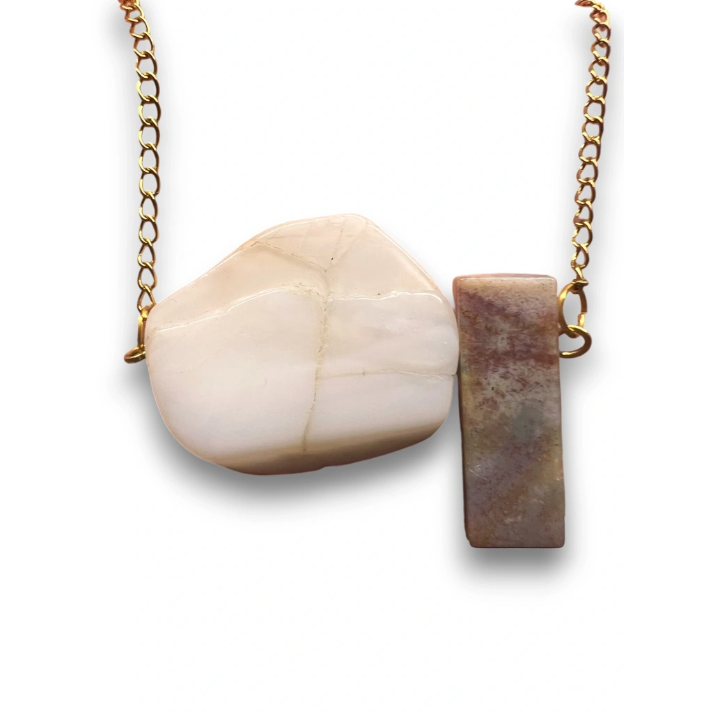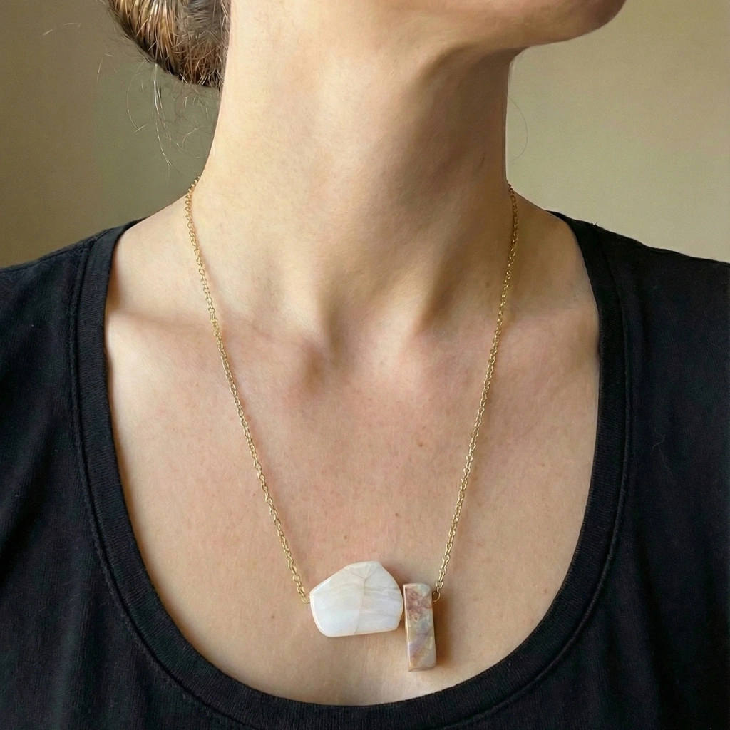 Bu kolye, iki farklı doğal taşın dengeli birlikteliğinden oluşur. Yumuşak tonları ve sade geometrik formu sayesinde zamansız bir görünüm sunar; hem günlük kombinlerde hem de daha minimal, şık stillerde rahatlıkla kullanılabilir.