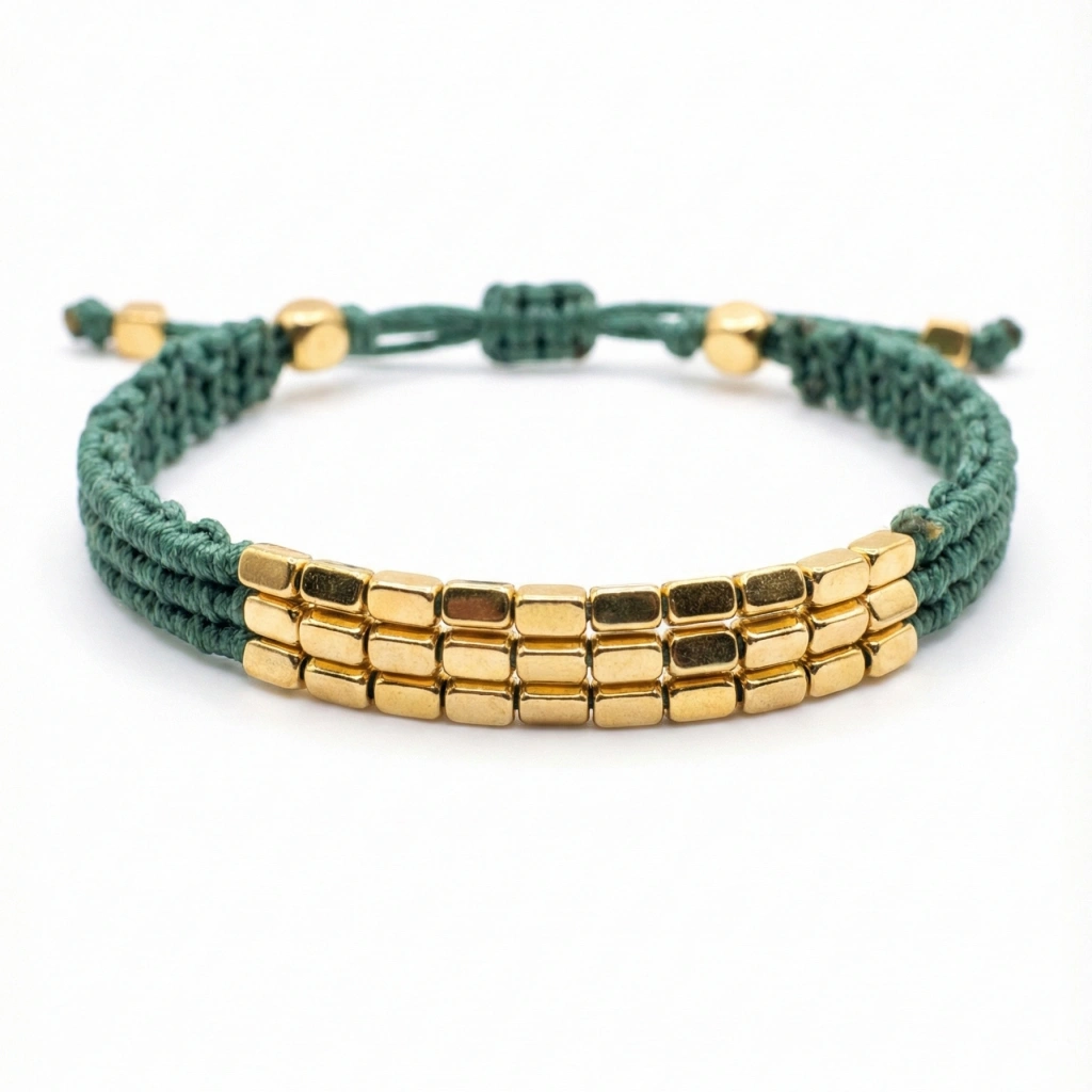 El işçiliğiyle üretilen bu bileklikler; ip, metal detaylar ve minimal formların modern bir yorumudur. Hafif yapısı ve ayarlanabilir tasarımı sayesinde gün boyu konforlu bir kullanım sunar. Tek başına sade bir şıklık yaratır, birlikte kullanıldığında ise güçlü ve dengeli bir stil tamamlayıcısına dönüşür. Zamansız tasarımıyla günlük kombinlerden özel anlara kadar her stile uyum sağlar. Üründe kullanılan metal parçalar altın kaplamadır.