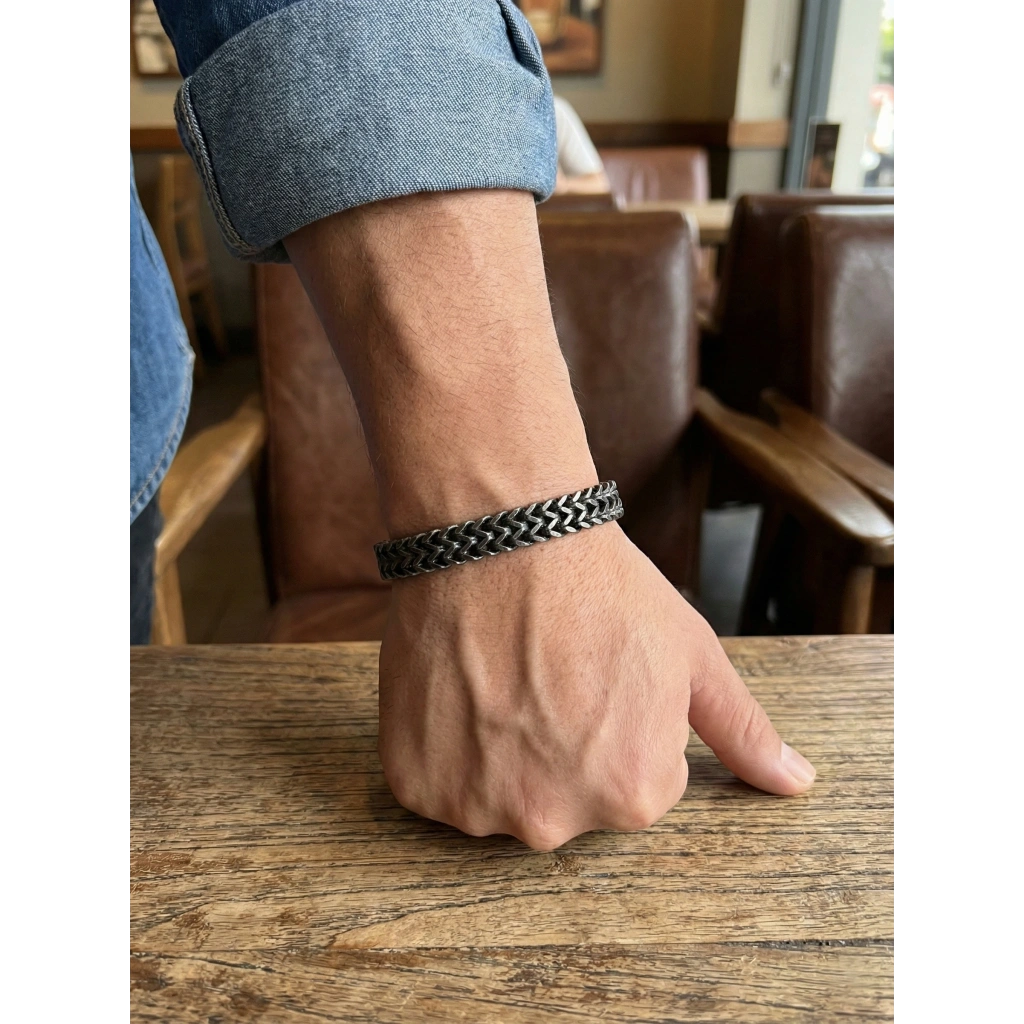 Maskülen duruşu ve net hatlarıyla öne çıkan bu metal erkek bileklik, sık dokulu örgü formu sayesinde bilekte güçlü bir görünüm yaratır. Mat siyah metal yüzeyi modern ve zamansız bir stil sunarken, mıknatıslı kilidiyle hem güvenli hem de pratik bir kullanım sağlar.