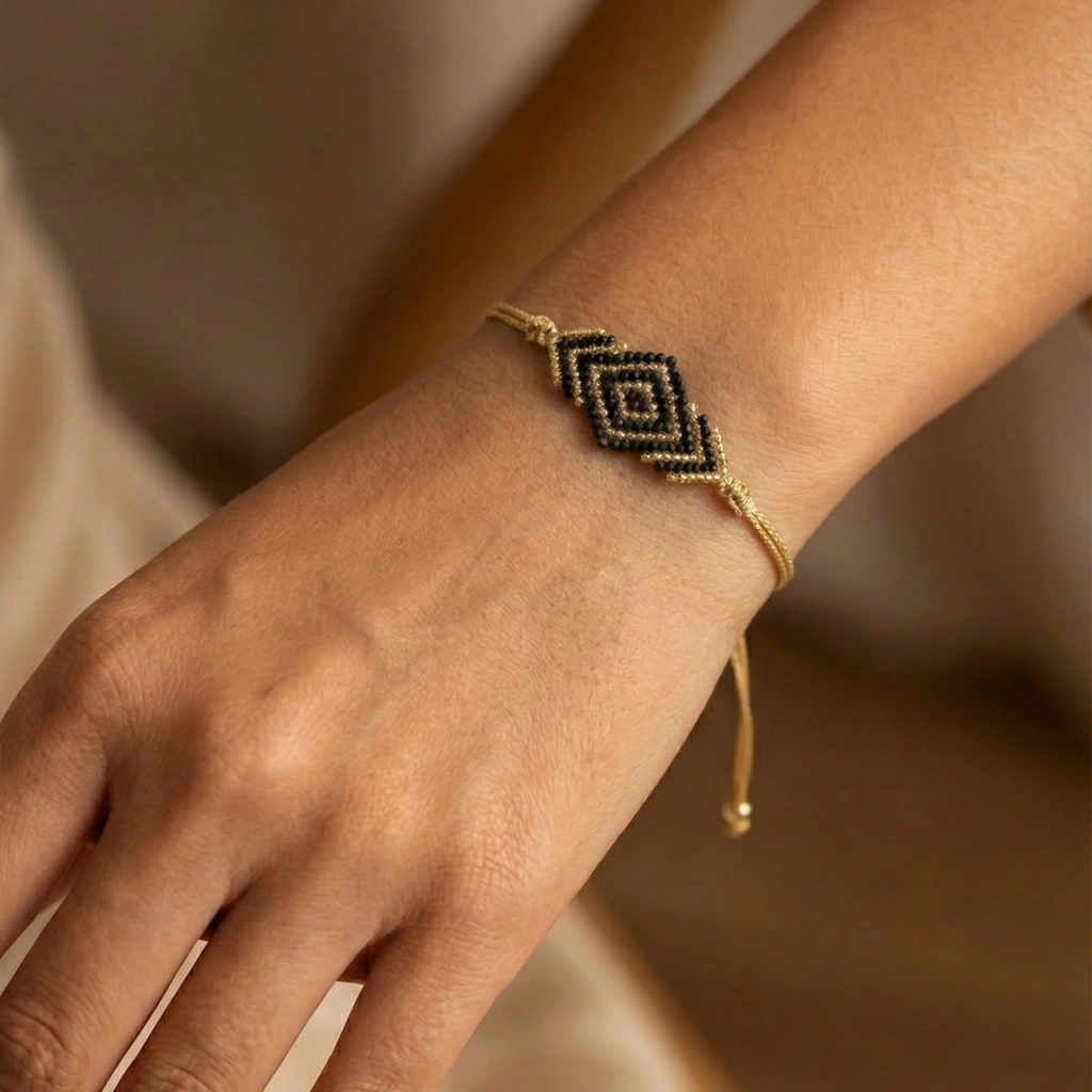 Miyuki Bileklik; Japon miyuki boncukların net formu ve düzenli dokumasıyla hazırlanır. Altın tonlu boncukların siyahla yarattığı kontrast, bilek üzerinde sofistike ve karakterli bir duruş sunar.