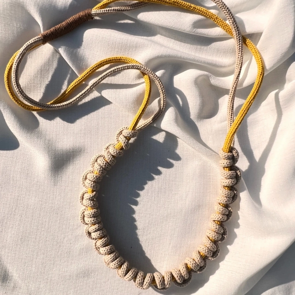 Bu el örgüsü iki renkli kolye, zarif ve modern bir tasarıma sahiptir. Yumuşak ipten özenle örülen kolye, hem şık hem de rahat bir kullanım sunar. İki farklı rengin uyumu, kolyeye dinamik bir görünüm kazandırmaktadır.