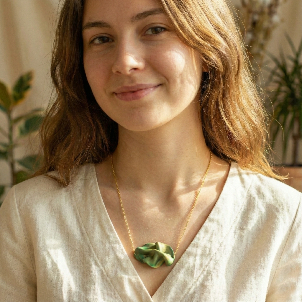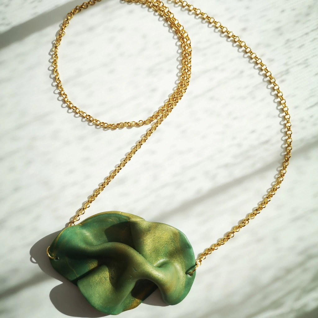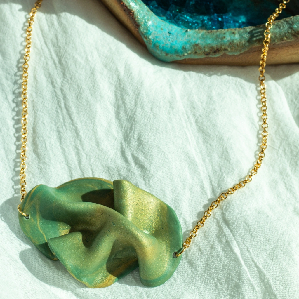 Bu şık kolye, zarif bir tasarıma sahip polimer kil ve altın kaplama zincirden üretilmiştir. Polimer kilin eşsiz dokusu ve canlı renkleri, kolyeye modern ve sanatsal bir hava katmaktadır. Altın kaplama zincir ise hem dayanıklılığı hem de şıklığı ile dikkat çekmektedir.