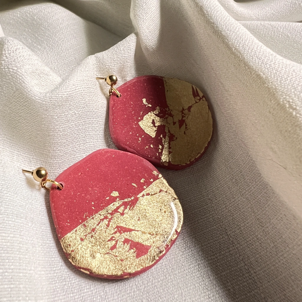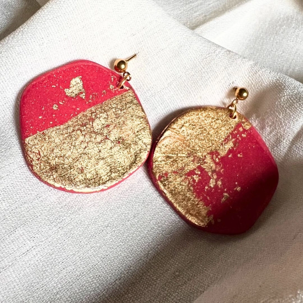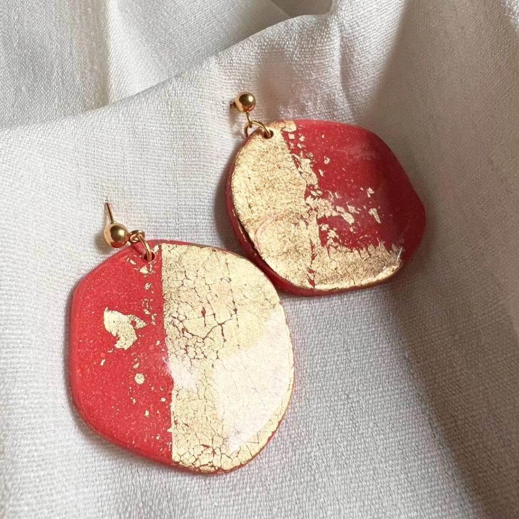 Yoğun kırmızı zemin üzerinde yer alan altın varak detaylar, her parçada kendine özgü bir doku ve hareket yaratır. Organik formu ve hafif yapısıyla hem günlük kullanıma hem de özel kombinlere uyum sağlar.