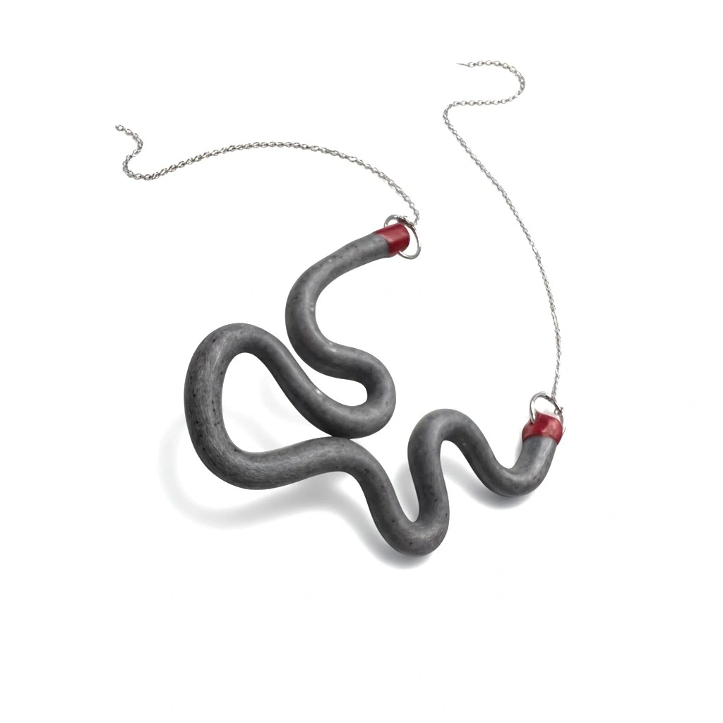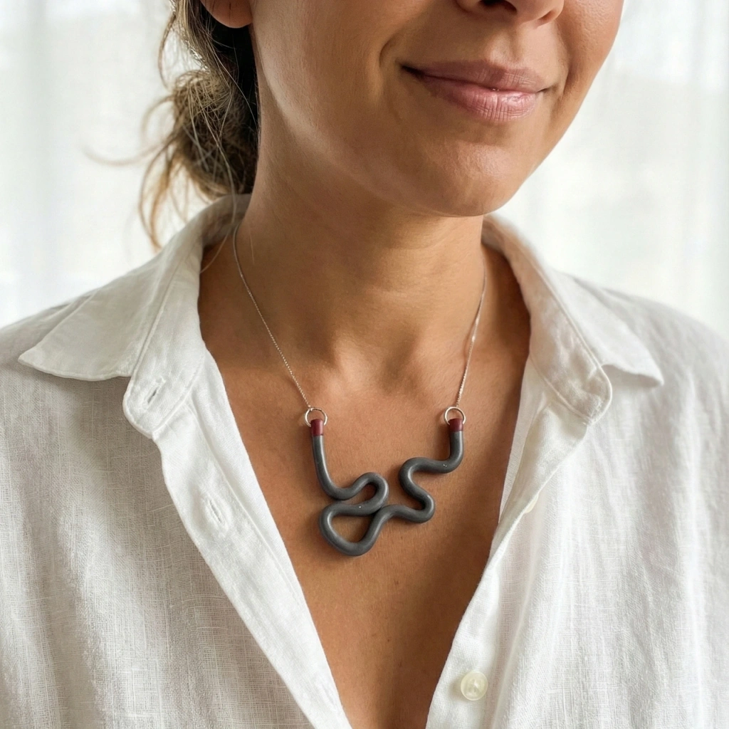 Spline serisinden bu kolye, polimer kilin yumuşak dokusunu kesintisiz bir çizgi formunda yorumlayan heykelsi bir tasarımdır.