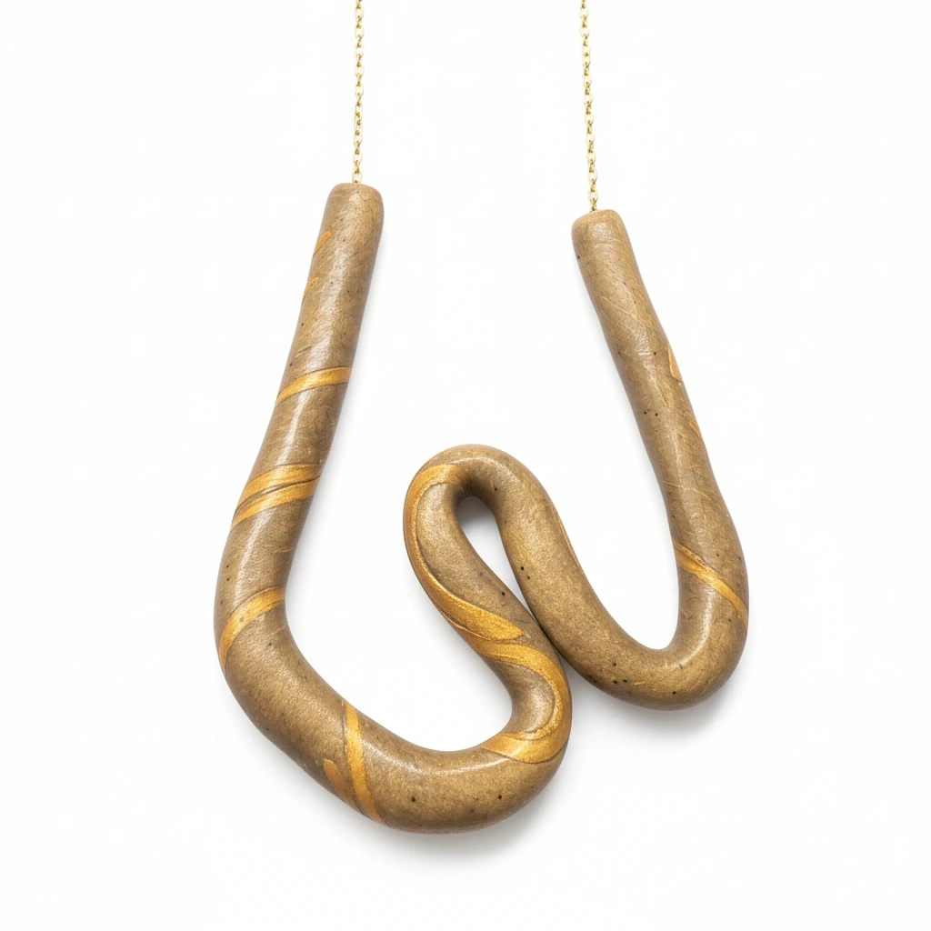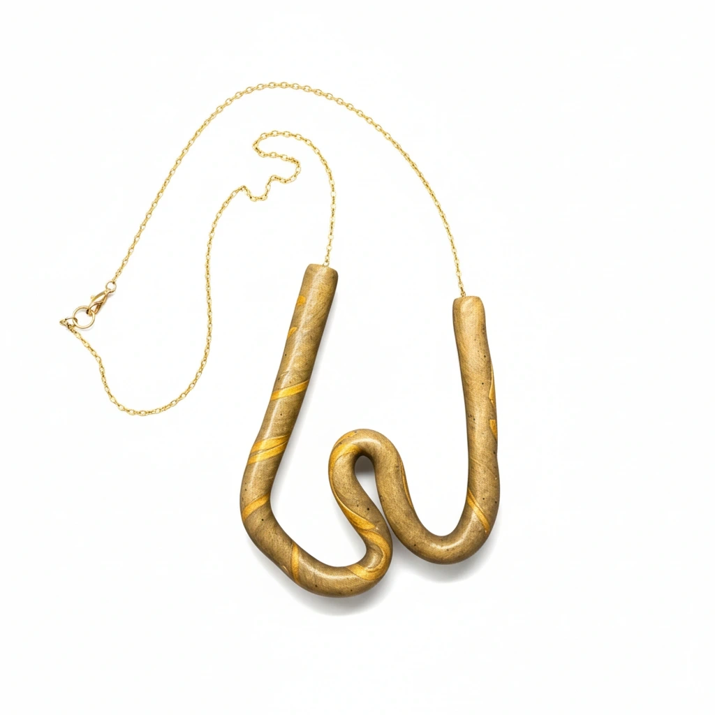 Spline serisinden bu kolye, polimer kilin yumuşak dokusunu kesintisiz bir çizgi formunda yorumlayan heykelsi bir tasarımdır.